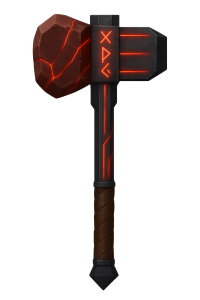 Der Hammer besitzt einen Schaft aus dunklem Tiefstahl, gekrönt von einem Kopf aus glühendem Herzsteinquarz, der bei Zorn rot aufleuchtet.