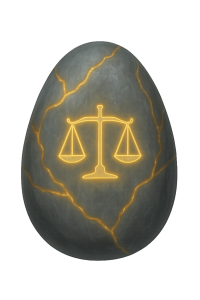 Der Schwurstein ist ein faustgroßer Monolith aus weißem Rechtsstein, durchzogen von goldenen Adern, die das Symbol Tyrs – die Waage – formen.
