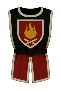 - Wappenzeichen: Ein rotes Banner mit goldener Flamme, darunter gekreuztes Schwert und Zauberstab.